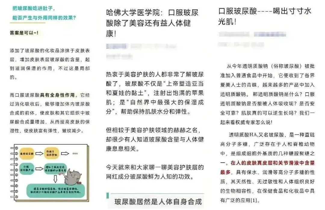 而关于玻尿酸食品能“吃出水光肌”更为直白的信息则来自大量互联网文章和博主。这些内容以“科学研究”或“亲身体验”等名义,宣称玻尿酸食品真能“吃出水光肌”。上海市消保委不禁要问,这些宣传的背后是不是有着不可示人的商业利益?而相关玻尿酸食品企业又扮演着什么角色?