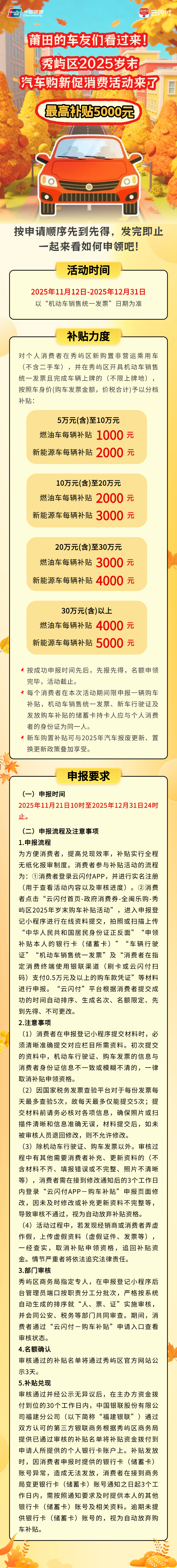 秀屿区汽车购新补贴来啦!最高补贴5000元!