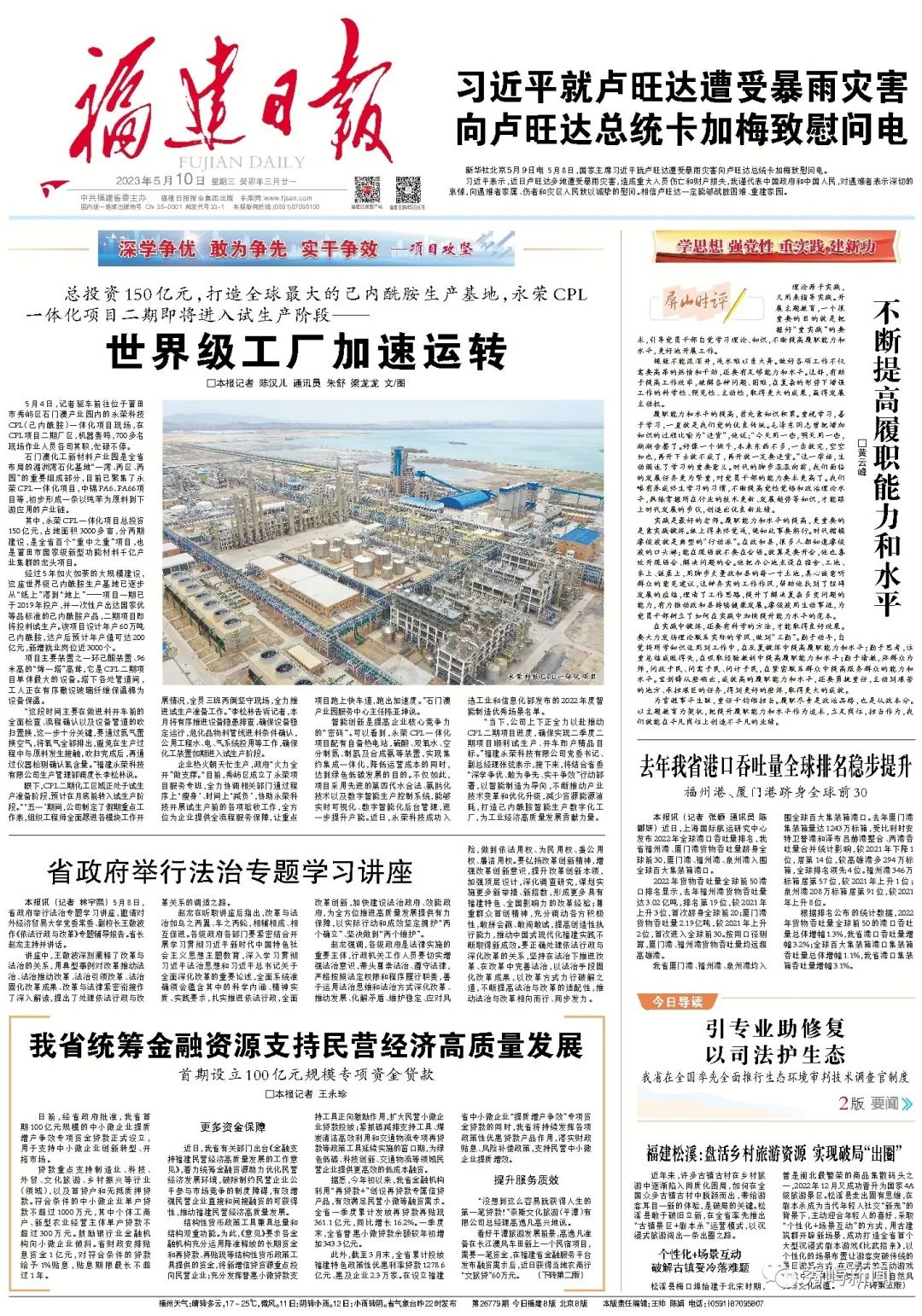 永荣科技CPL一体化项目 石门澳化工新材料产业园是全省布局的湄洲湾石化基地“一湾、两区、两园”的重要组成部分,目前已聚集了永荣CPL一体化项目,中锦PA6、PA66项目等,初步形成一条以纯苯为原料到下游应用的产业链。 其中,永荣CPL一体化项目总投资150亿元,占地面积3000多亩,分两期建设,是全省百个“重中之重”项目,也是莆田市国家级新型功能材料千亿产业集群的龙头项目。 经过5年如火如荼的大规模建设,这座世界级己内酰胺生产基地已逐步从“纸上”落到“地上”——项目一期已于2019年投产,并一次性产出达国家优等品标准的己内酰胺产品,二期项目即将投料试生产。该项目设计年产60万吨己内酰胺,达产后预计年产值可达200亿元,新增就业岗位近3000个。 项目主要装置之一环己酮装置、96米高的“烯一塔”高耸,它是CPL二期项目单体最大的设备。塔下各处管道间,工人正在有序敷设玻璃纤维保温棉为设备保温。 “这段时间主要在做进料开车前的全面检查、流程确认以及设备管道的吹扫置换,这一步十分关键,要通过氮气置换空气,将氧气全部排出,避免在生产过程中与原料发生接触,吹扫完成后,再通过仪器检测确认氧含量。”福建永荣科技有限公司生产管理部调度长李松林说。 眼下,CPL二期化工区域正处于试生产准备阶段,预计在月底前转入试生产阶段。“‘五一’期间,公司制定了假期重点工作表,组织工程师全面跟进各模块工作开展情况,全员三班两倒坚守现场,全力推进试生产准备工作。”李松林告诉记者,本月将有序推进设备隐患排查,确保设备稳定运行,危化品物料管线进料条件确认,公用工程水、电、气系统投用等工作,确保化工装置如期进入试生产阶段。 企业热火朝天忙生产,政府“火力全开”做支撑。“目前,秀屿区成立了永荣项目服务专班,全力协调相关部门通过程序上‘瘦身’、时间上‘减负’,协助永荣科技开展试生产前的各项验收工作,全方位为企业提供全流程服务保障,让重点项目跑上快车道,跑出加速度。”石门澳产业园服务中心主任陈亚坤说。 智能创新是提高企业核心竞争力的“密码”。可以看到,永荣CPL一体化项目配有自备热电站,硫酸、双氧水、空分制氮、制氢及合成氨等装置,实现集约集成一体化,降低运营成本的同时,达到绿色低碳发展的目的。不仅如此,项目采用先进的第四代水合法、氨肟化技术以及数字智能生产控制系统,能够实时可视化、数字智能化后台管理,进一步提升产能。近日,永荣科技成功入选工业和信息化部发布的2022年度智能制造优秀场景名单。 “当下,公司上下正全力以赴推动CPL二期项目进度,确保实现二季度二期项目顺利试生产、开车即产精品目标。”福建永荣科技有限公司党委书记、副总经理张弦表示,接下来,将结合省委“深学争优、敢为争先、实干争效”行动部署,以智能制造为导向,不断推动产业技术变革和优化升级,减少资源能源消耗,打造己内酰胺智能生产数字化工厂,为工业经济高质量发展贡献力量。 |
