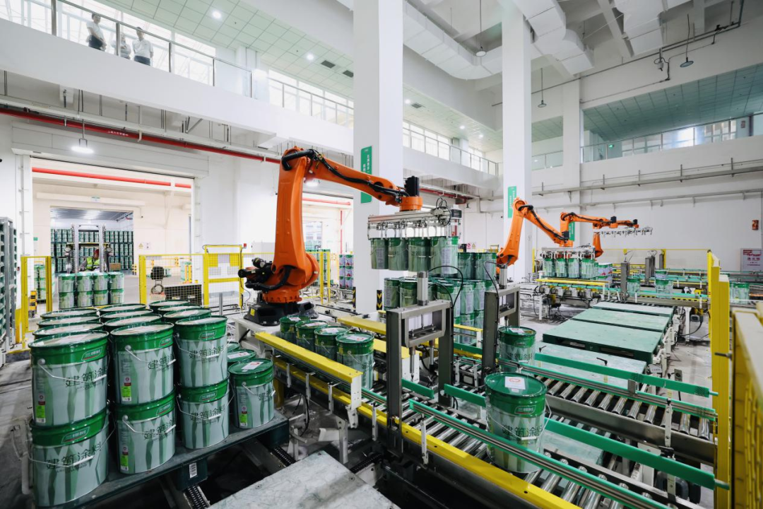 记者看到,偌大的车间内,仅有几名技术工人在监测管理着机器的运行。一桶桶已经完成包装的涂料,在流水线上“飞奔”。生产线的末端是4台码垛机器人,正高效地将产品有序码放在托盘上,等待转运往仓库。“自动化设备的投入,让整个流水线的效能提升了40%,不仅节省人力,又大大增加投料准确性,保证每一罐乳胶漆都有相同的品质保障。”现场技术工人说道。