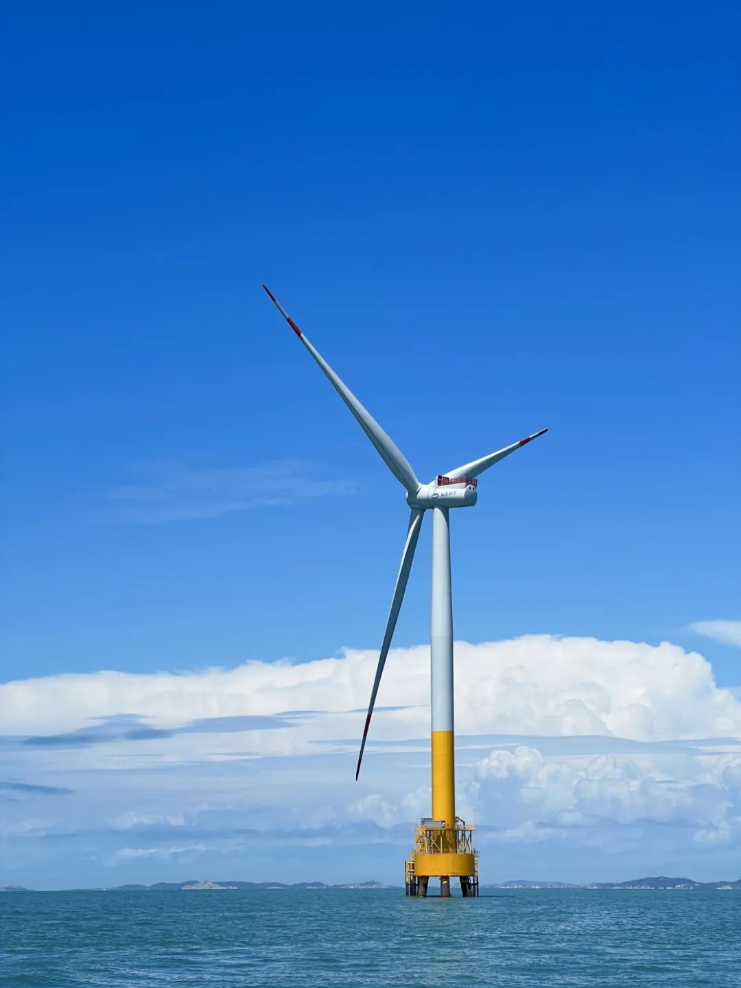 碧海蓝天下,一台台白色风车高高耸立在海面上,巨大叶片展翅飞旋在天地之间,将广阔大海的阵阵海风化为绿色清洁电能,点亮千家万户。