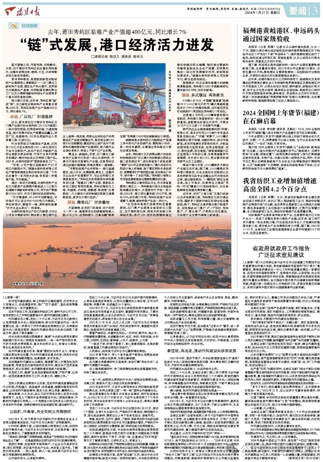 借力港口优势,近年来,秀屿区集“链”成“群”,发力新型功能材料产业等重点领域。2023年,秀屿区临港产业产值超400亿元,同比增长7%。