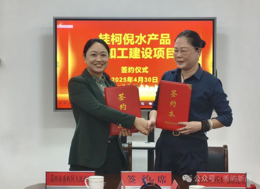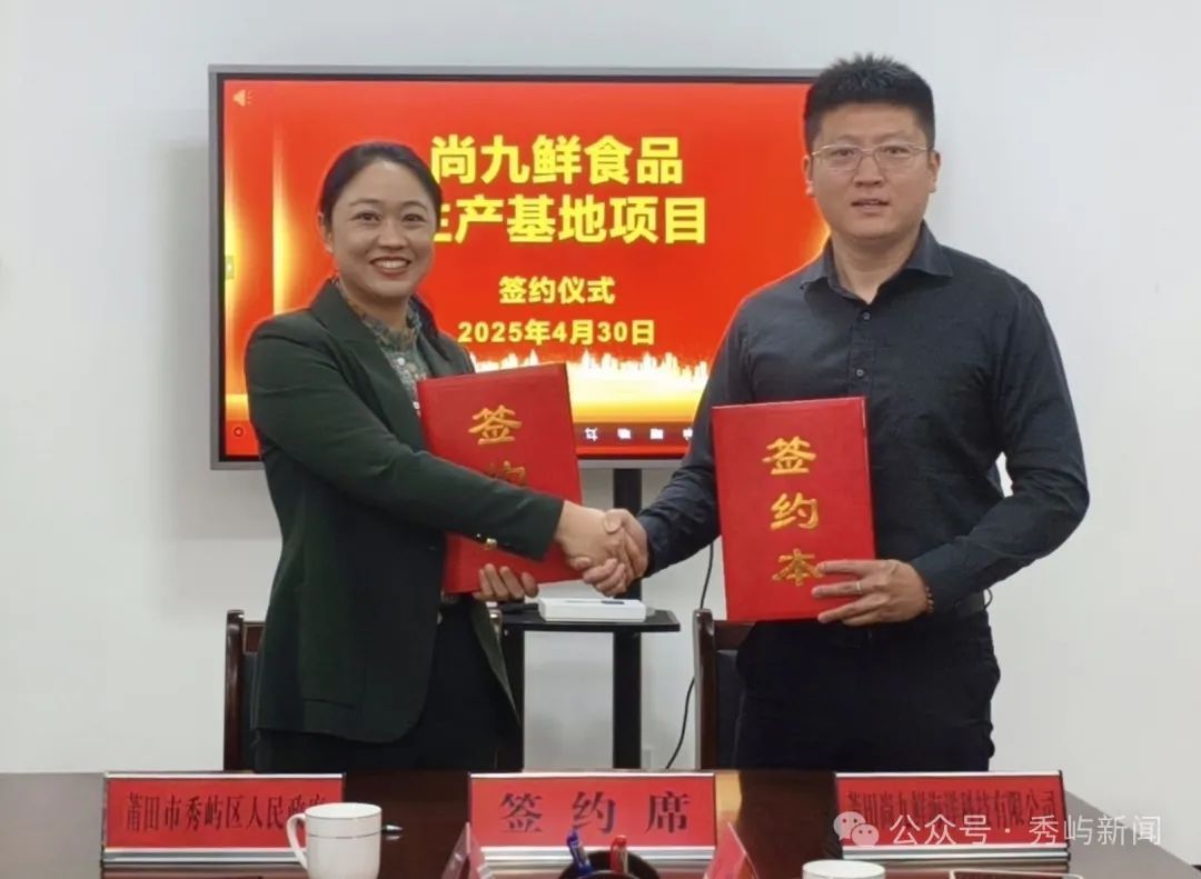 4月30日上午,秀屿区举行桂柯倪水产品深加工、尚九鲜食品生产基地项目签约仪式,项目正式入驻鲍鱼科技(现代食品)产业园。区政府党组成员、湄国投经开区常务副主任郑燕平,莆田市桂柯倪水产品有限公司总经理陈玲颖,莆田尚九鲜海洋科技有限公司副董事长王晨出席仪式。